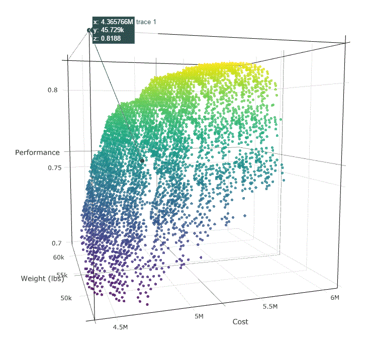 Plot.ly is a great Javascript based visualization tool. Here I try to get a better understanding of a solution set of Pareto optimal points.