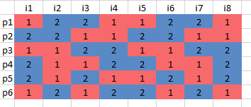 where \(x_{i,c} \in \{0,1\}\) indicating whether color \(c\) is selected for position \(i\). For \(n=8\) and two colors we find six solutions: