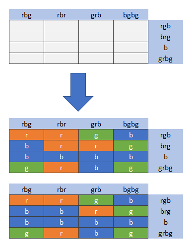 - Row 2 is "bbrg", "brrg" or "brgg"