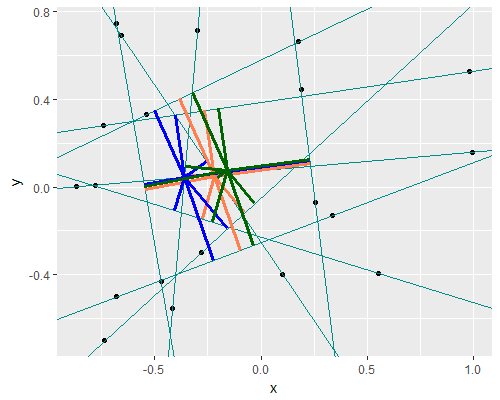 Actually I cheated a bit: I minimized the sum of the squared distances. When really minimizing the sum of the distances we need to minimize: \[\min_q\>\sum_j \sqrt{\frac{|p_{j,a}-q|^2 |p_{j,b}-p_{j,a}|^2 - \left[(p_{j,a}-q)\cdot (p_{j,b}-p_{j,a}) \right]^2}{|p_{j,b}-p_{j,a}|^2}}\] This can be solved as an NLP (Nonlinear Programming) model.