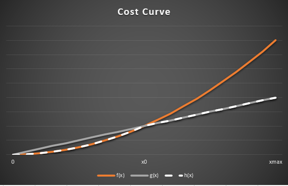 We want to model that the costs are represented by the function \(h(x)\) (the dashed curve in the picture). Let's make a few assumptions: