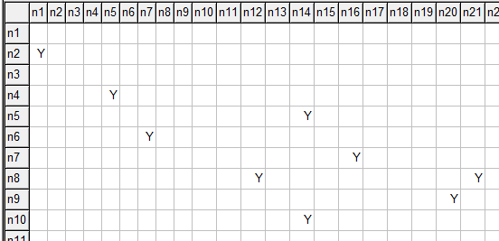 We have \(n=5,000\) nodes. Arcs are modeled by a two-dimensional subset a(i,j). This set is sparse: only relatively few arcs exist. The step to generate approximately \(0.05 n^2\) takes a few seconds: we draw and compare \(n^2\) random numbers. We actually have 1,250,314 entries afterwards. This is indeed sparse: