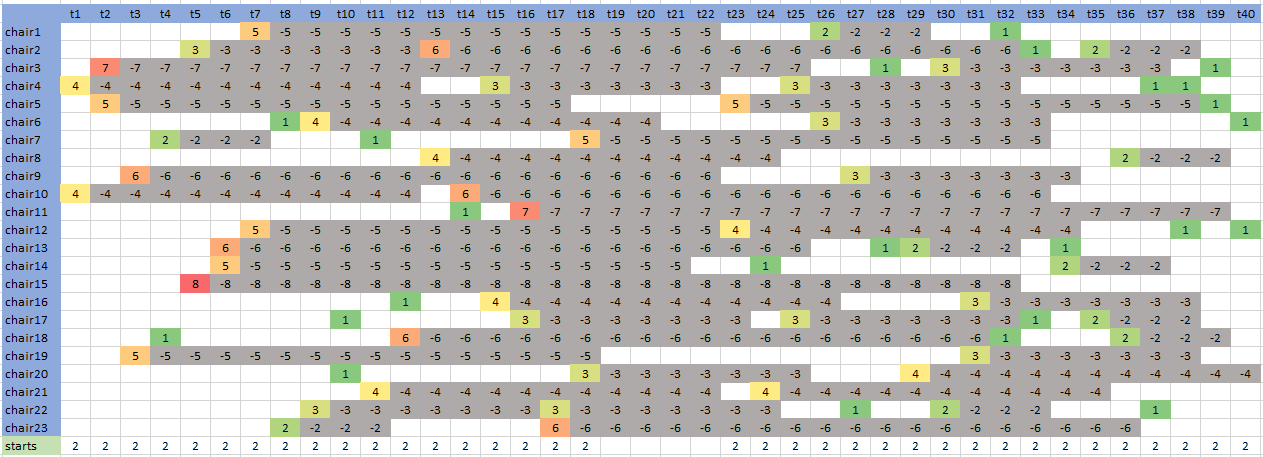 The last constraint says \(\mathit{usechair}_c \le \mathit{usechair}_{c-1}\) for \(c\gt 1\) (this last condition is implemented by indexing the constraint as order(c-1)). The purpose of this constraint is two-fold: (1) reduce symmetry in the model which hopefully will speed up things, and (2) make the solution better looking: all the unused chairs are at the end. With this, an optimal schedule looks like: