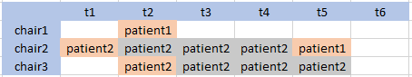 A chair can be occupied by zero or one patients: \[\sum_p \left( \mathit{start}_{c,p,t} + \mathit{next}_{c,p,t}\right)\le 1 \>\forall c,t\]