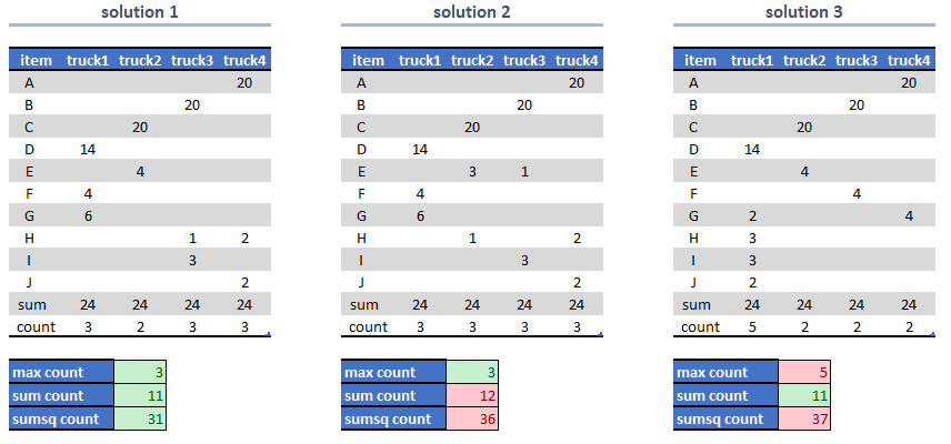 If we minimize the max count we can find the first or second solution: both have an optimal max count of 3. If we only focus on the sum, we can find the first or the last solution, both with a sum count of 11. The conclusion is: if we use min max count or min sum count as objective, we may see undesirable outcomes. So, if we want to develop a model that has a preference for solutions like the first one, we actually have to look at both, and use a multiple objective problem: