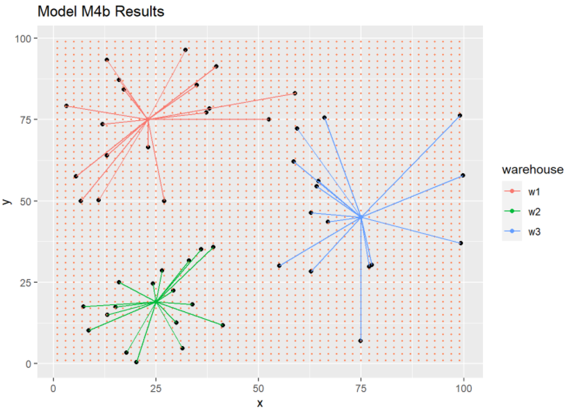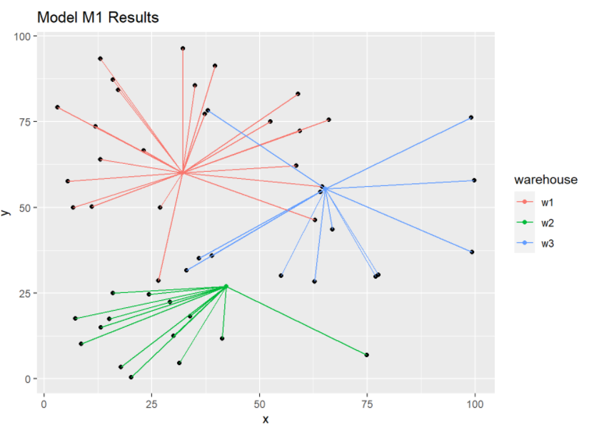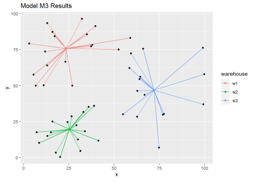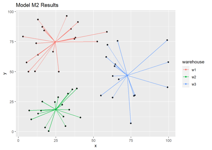 This picture is much better. We see that the location of warehouses and the assignments make much more sense.
