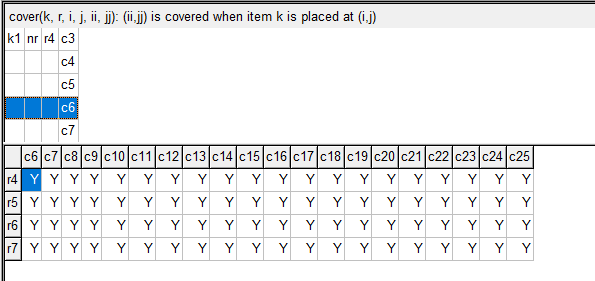 The second set is \(\color{darkblue}{\mathit{cover}}_{k,r,i,j,i',j'}\) indicating which cells \((i',j')\) are covered when placing item \(k\) on cell \((i,j)\). This is a large 6 dimensional set. It has 282,944 elements.
